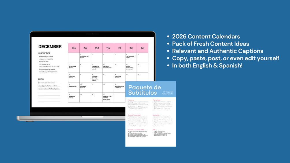 Take the stress out of content planning! The Bilingual Creator Kit is designed for Hispanic and bilingual voices who want to grow their online presence with ease, clarity, and confidence—in both English and Spanish.